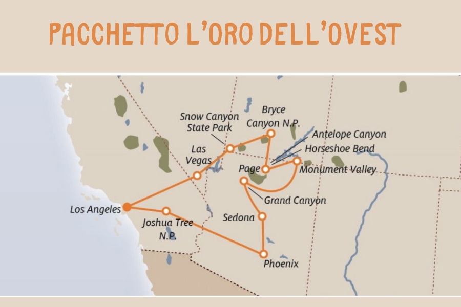 The tour begins in Los Angeles, the gateway to California, before heading toward Joshua Tree National Park, where the Mojave Desert meets the Colorado Desert. Arizona then reveals an ever-changing panorama: Sedona, the immense Grand Canyon, the legendary Monument Valley and the dramatic viewpoint of Horseshoe Bend, followed by the sculpted sandstone walls of Antelope Canyon.